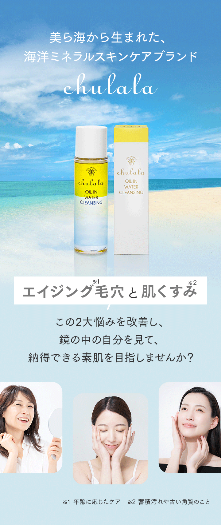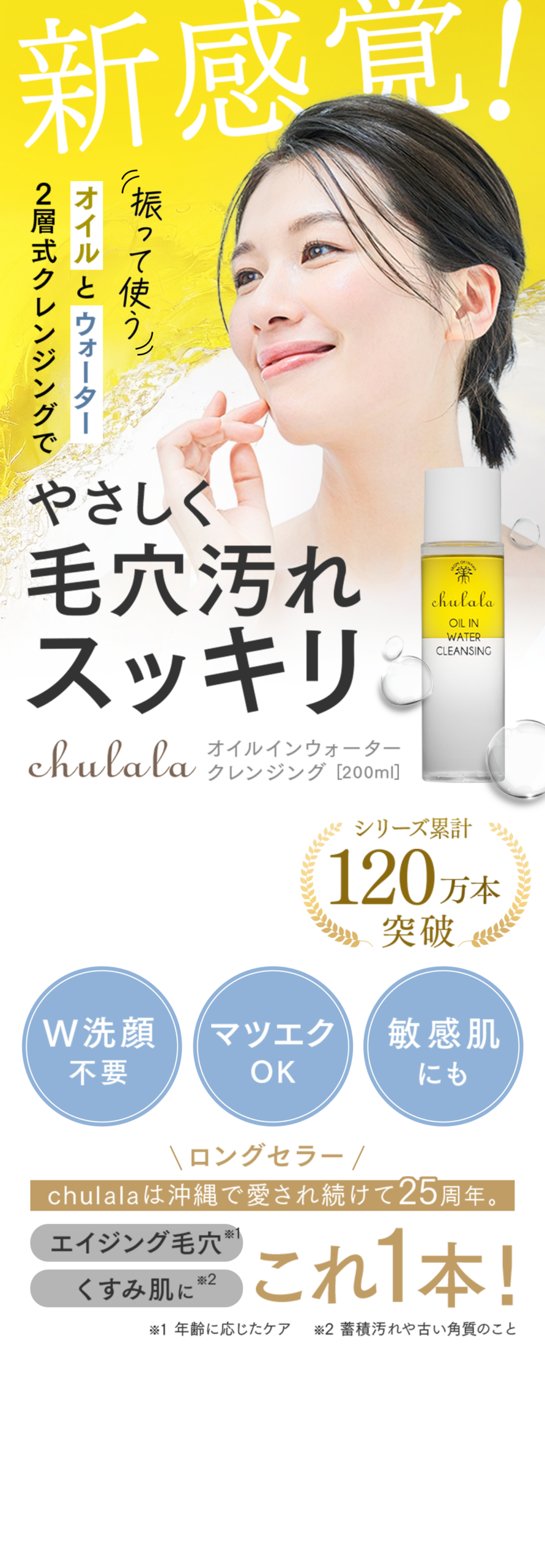 「メイクはきちんと落としたい。でも、クレンジング後のつっぱり感や刺激はできるだけ避けたい」──そんな悩みを持つ方に向けて開発されたのが、ちゅらら オイルインウォータークレンジングです。ウォーターとオイルの“いいとこ取り”に加え、微細な泡(ウルトラファインバブル)の力で汚れを浮かせて落とす設計。さらに沖縄由来成分を取り入れ、クレンジング後の肌コンディションまで整えることを目指した自然派クレンジングとして注目されています。